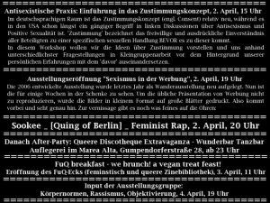 Als Frühlingshighlight organisierte die Schenke in Kooperation mit dem Marea Alta Anfang April 2011 eine dreitägige Veranstaltungsreihe mit Workshops, Vernissage „Sexismus in der Werbung“ , Sookee-Konzert, Auflegerei im Marea Alta und Brunch.